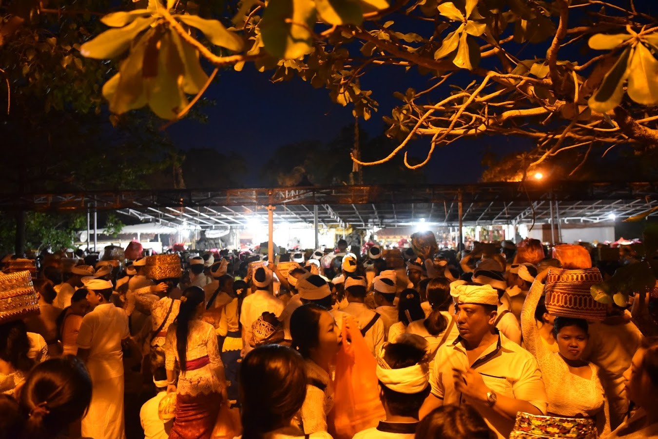 2つのお寺の集合ブロックの間で、並んで待つ人々